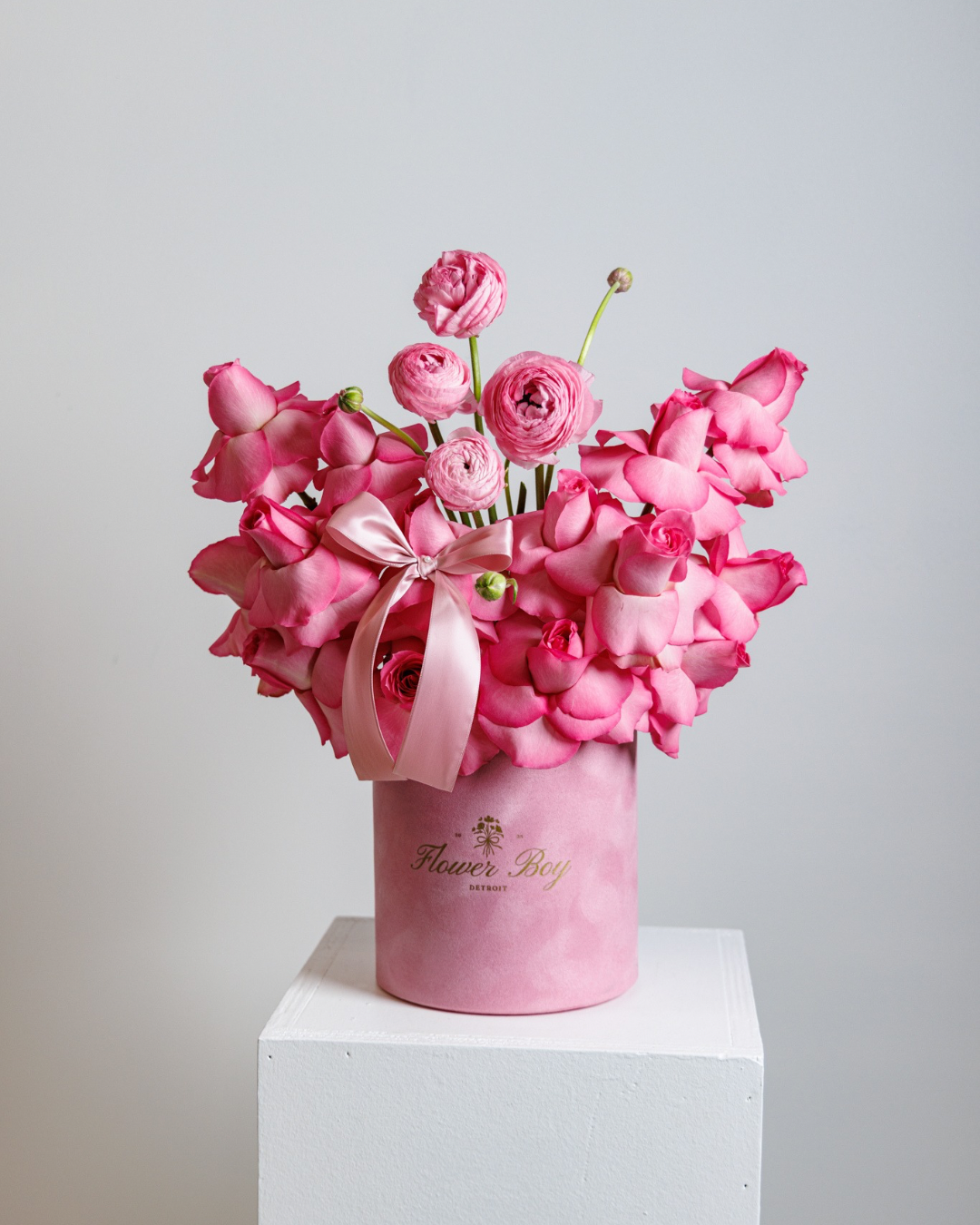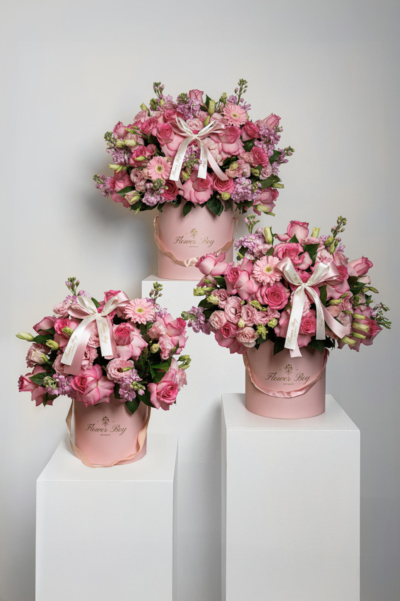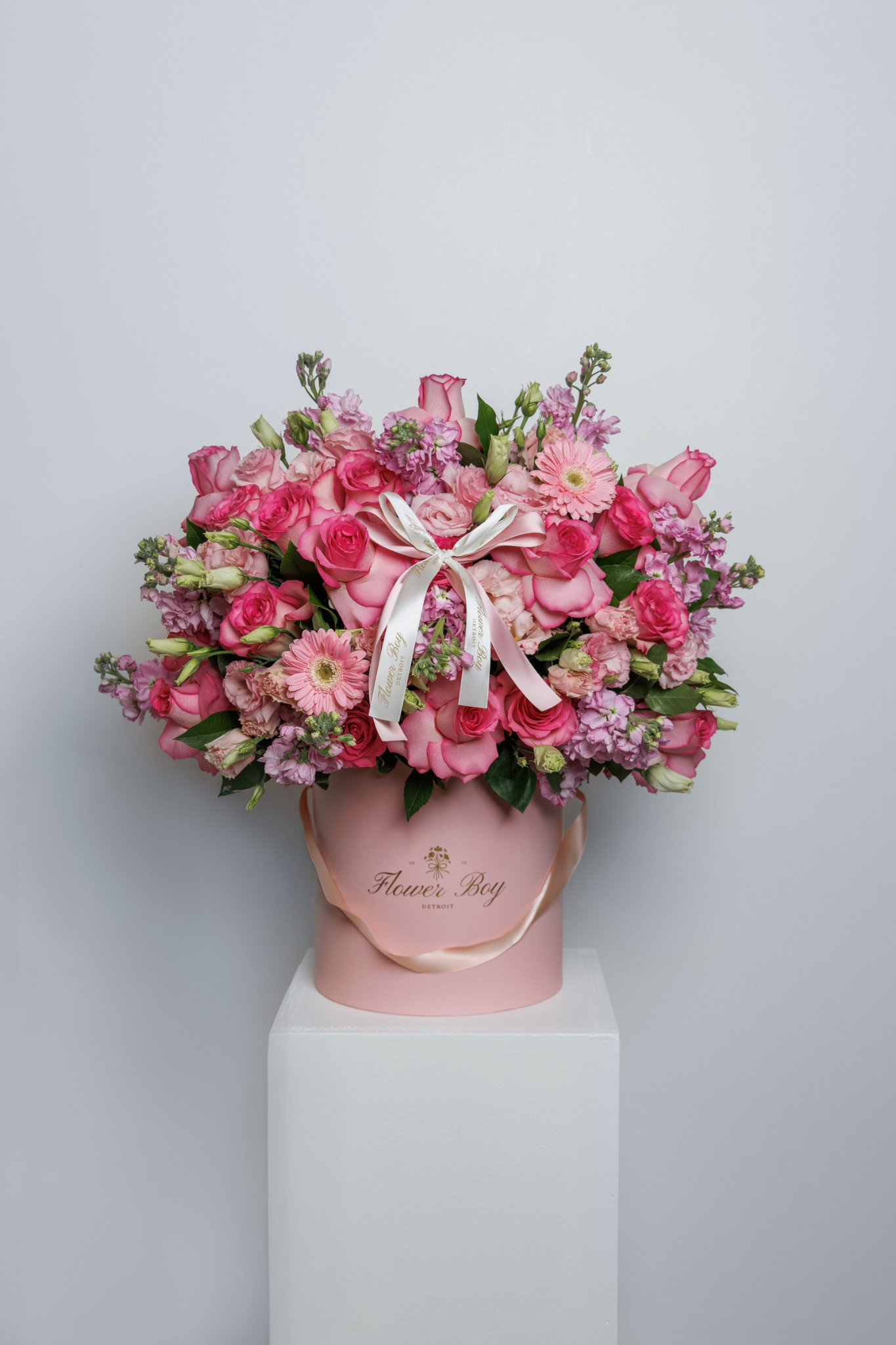 Our signature pink flower box is perfect for any occasion. This arrangement is composed of mixed flowers, including roses, stock, lisianthus, and gerbera daisy’s. Pictured is the large size, this arrangement is available in a small, medium and large.