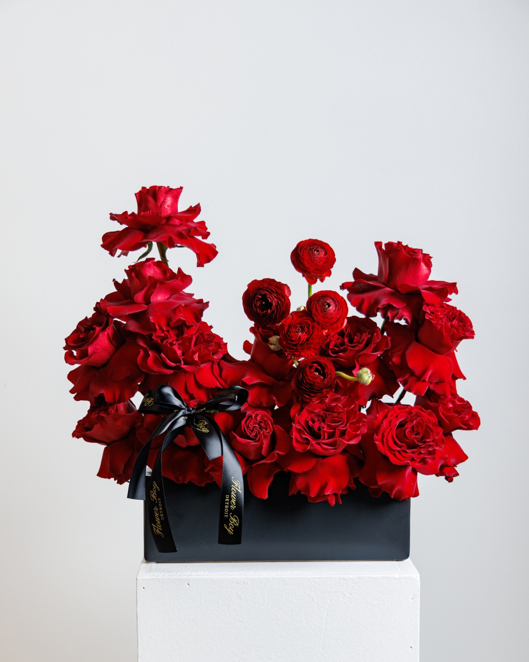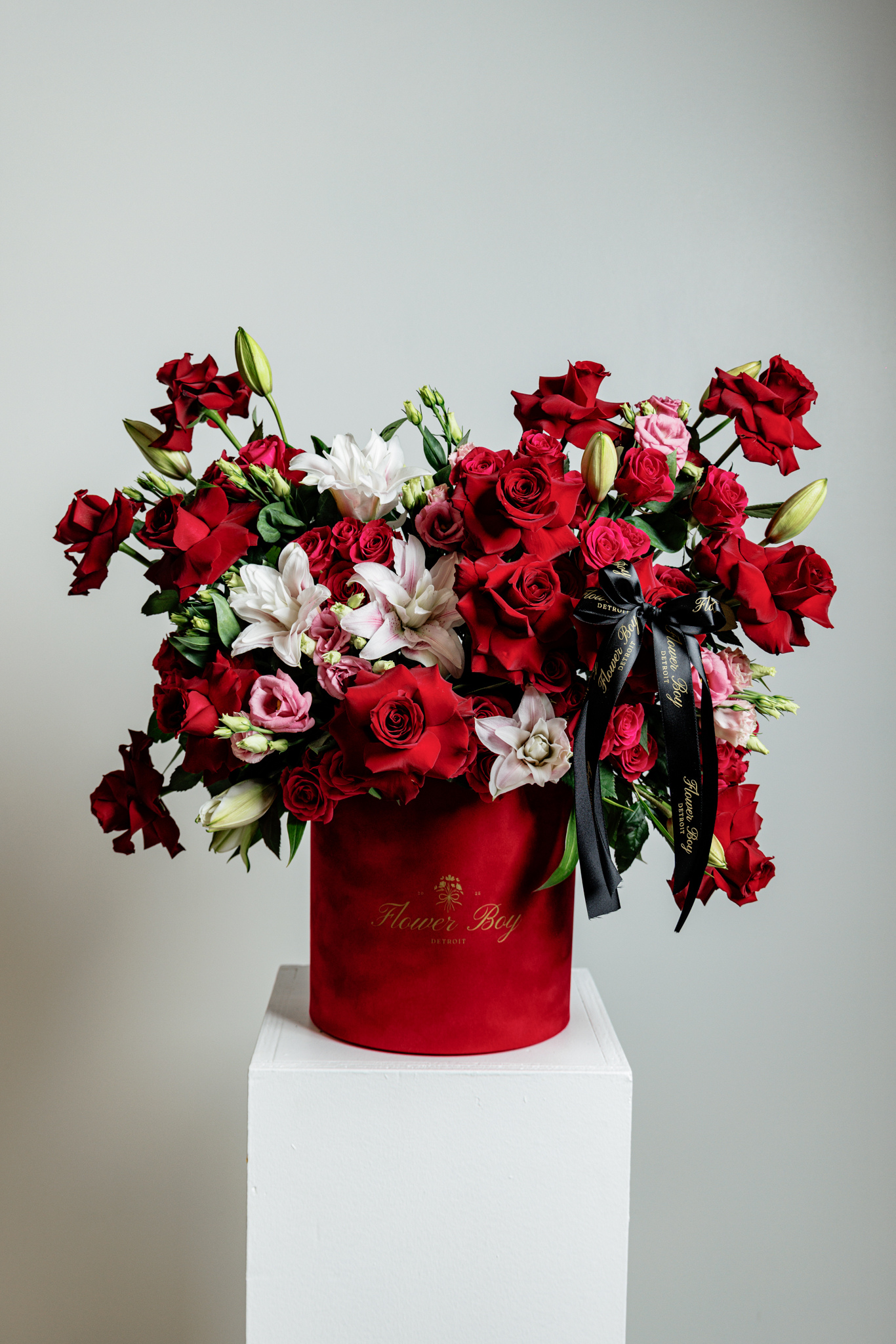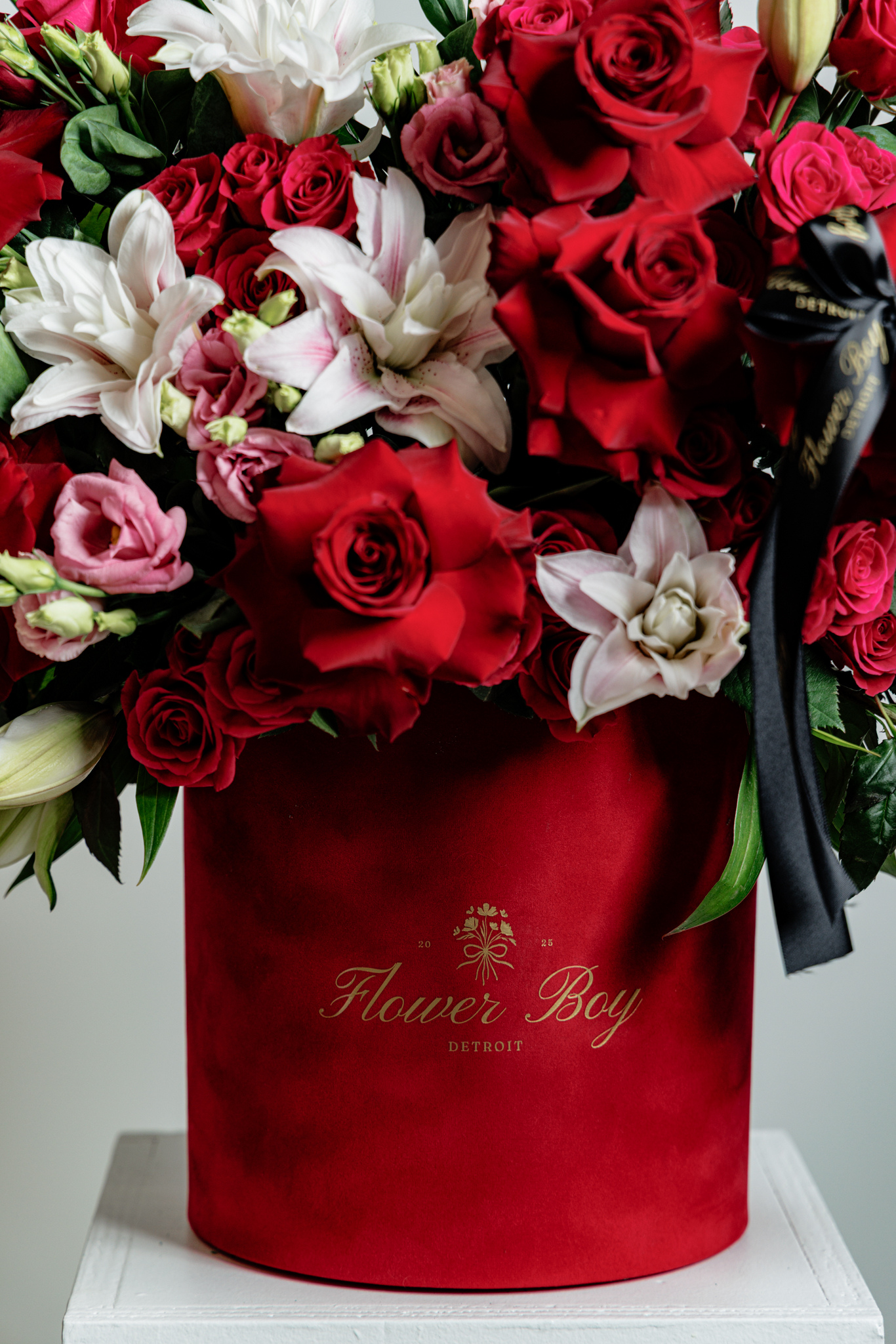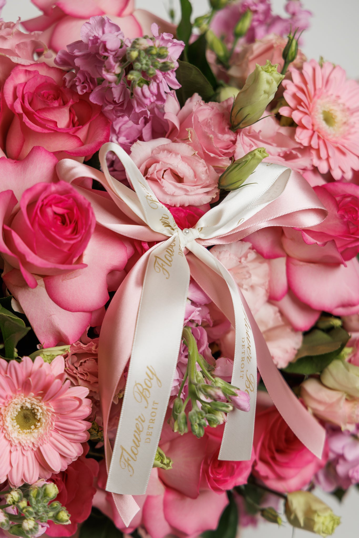 Our signature pink flower box is perfect for any occasion. This arrangement is composed of mixed flowers, including roses, stock, lisianthus, and gerbera daisy’s. Pictured is the large size, this arrangement is available in a small, medium and large.