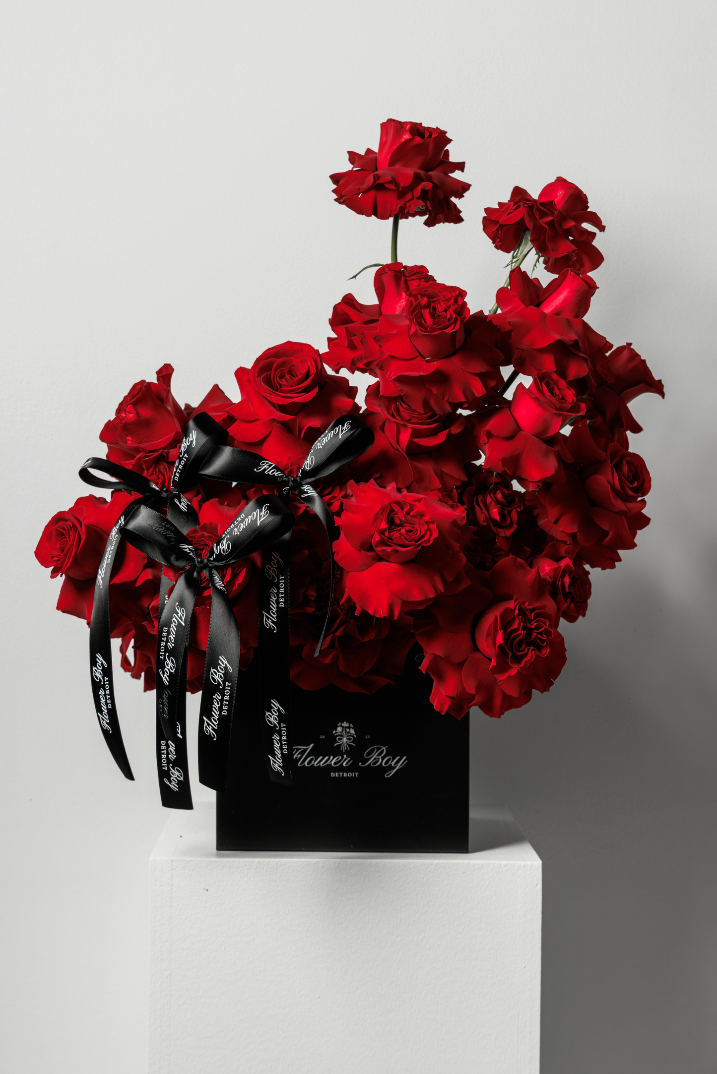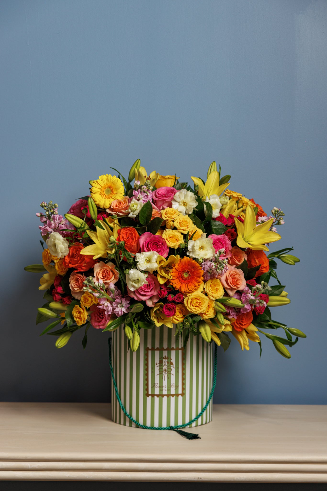 Our signature pink flower box is perfect for any occasion. This arrangement is composed of mixed flowers, including roses, stock, lisianthus, and gerbera daisy’s. Pictured is the large size, this arrangement is available in a small, medium and large.