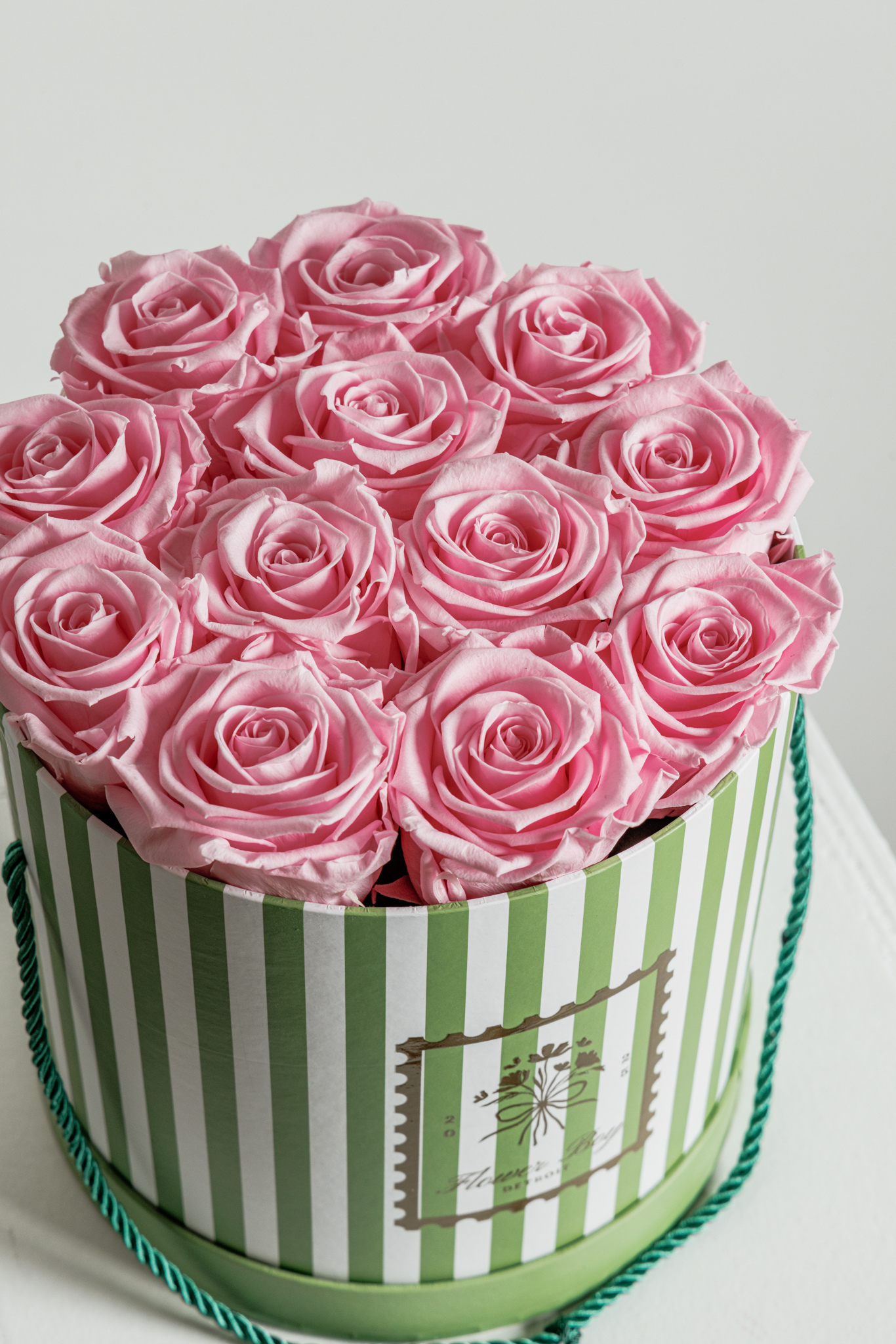 These forever roses are preserved to last 3+ years. 12 pink forever roses in a green striped round box